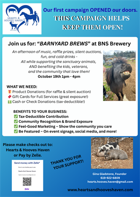 Join Hearts & Hooves Haven, Your Lakeside Non-profit Farm Animal Sanctuary, for an afternoon of fun, community, and compassion at Barnyard Brews, hosted at BNS Brewery in Lakeside!